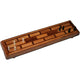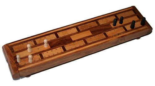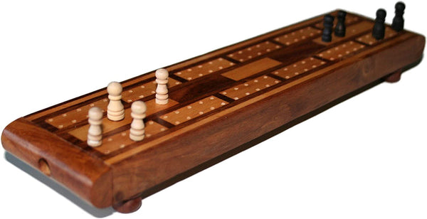 Hand-crafted mixed wood cribbage board, inlaid with box wood. Contains carved wooden pegs that can be store in the ends of the board when not in use. A great gift for any cribbage player, new or old to score their game of crib.