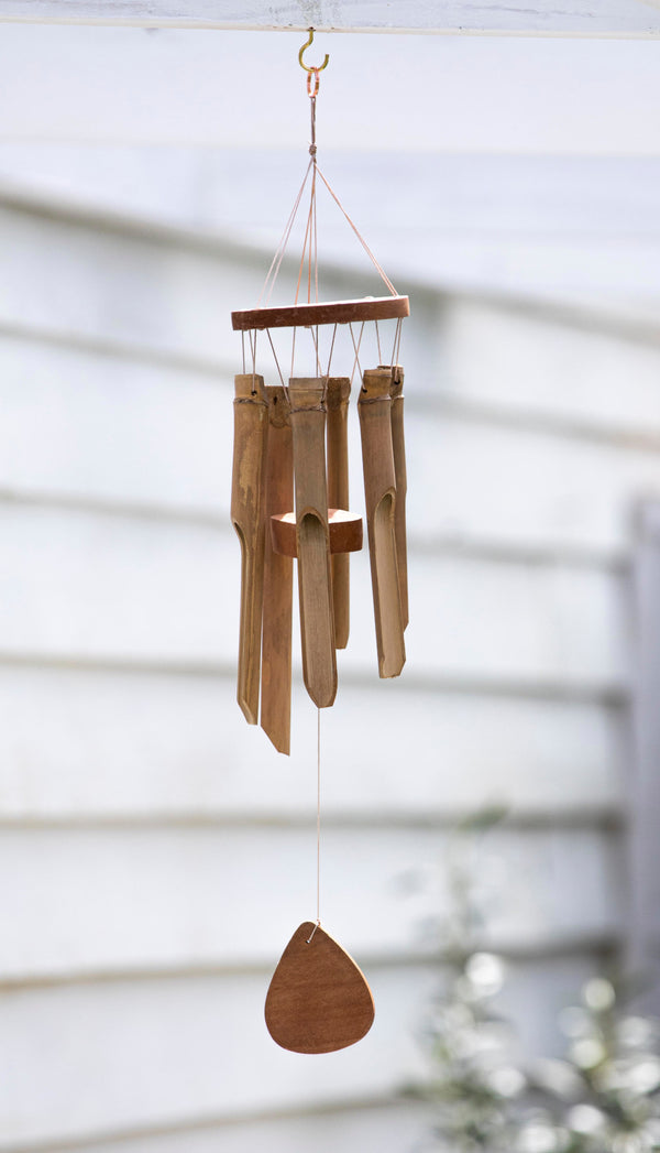 A small natural bamboo wind chime that makes a soothing sound when the wind blows. Has 6 small bamboo chimes.
